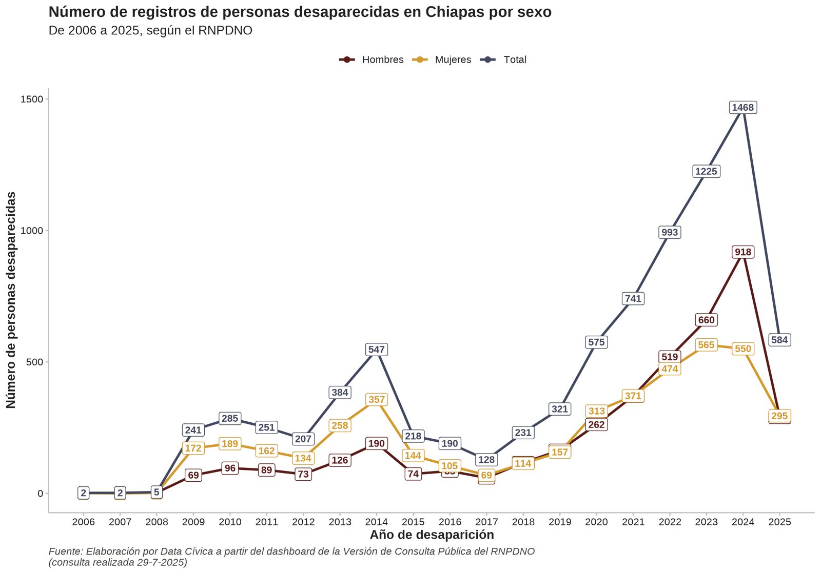 En Chiapas, las desapariciones comenzaron a aumentar en 2018, y fueron en ascenso hasta sumar 8,589 personas en el primer semestre de 2025, según un registro que hizo Data Cívica con datos del Registro Nacional de Personas Desaparecidas y No Localizadas (RNPDNO).
