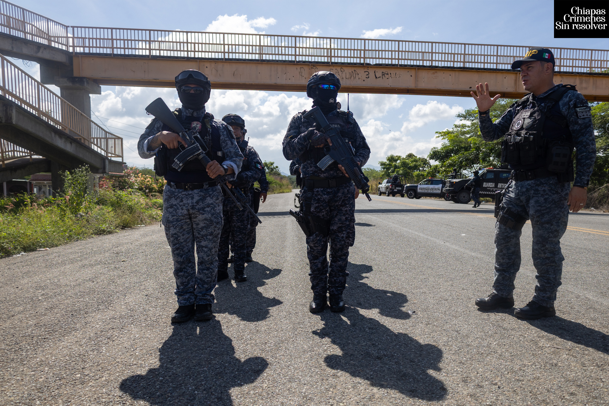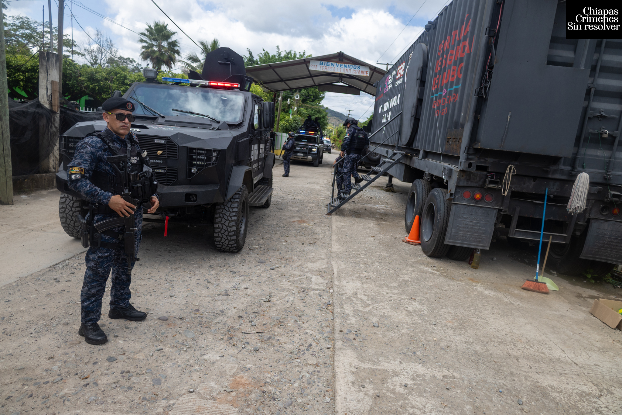 Santa Teresa Llano Grande.-En la Sierra de Chiapas, a unos cuantos pasos de la frontera entre México y Guatemala un rinoceronte blindado permanece estacionado frente a una base móvil. Su estructura gris está reforzada con una cubierta antibalas, y es conocido como Kanan —“guardián” en maya—, estos equipos buscan controlar este punto al que llegamos, el más peligroso de Chiapas.
